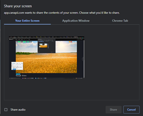 To screen share, click on the Screen share icon. In the pop-up screen select what you want to share, this can be your entire screen, an application window, or a browser tab.