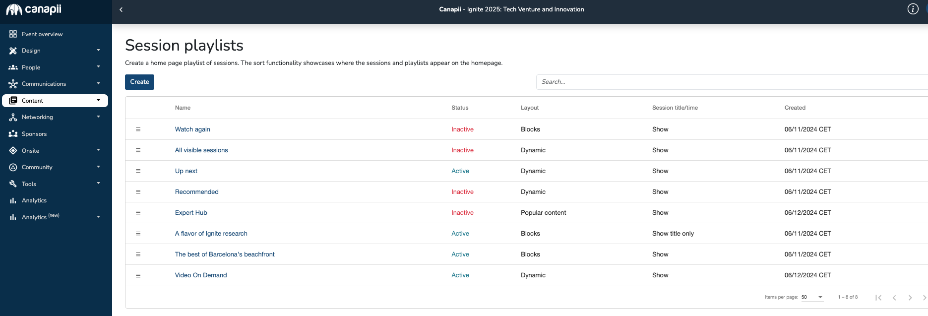 Once you have sessions, go to Content > Playlist tab and on this page, you’ll find a default playlists: All visible sessions, Watch again, Up next, and Recommended . These are auto generated by the system but you are free set the playlist as active or inactive as needed. You can also create new playlists easily by clicking on the Create button.