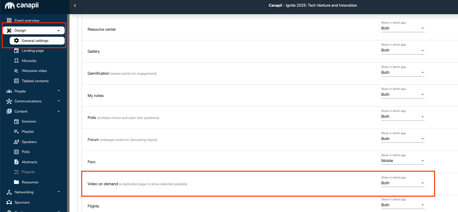 – Video on demand – Playlists which are only visible within a VOD page. Please note that the Video on demand page needs to be enabled under Design > General Settings > Pages as shown below: