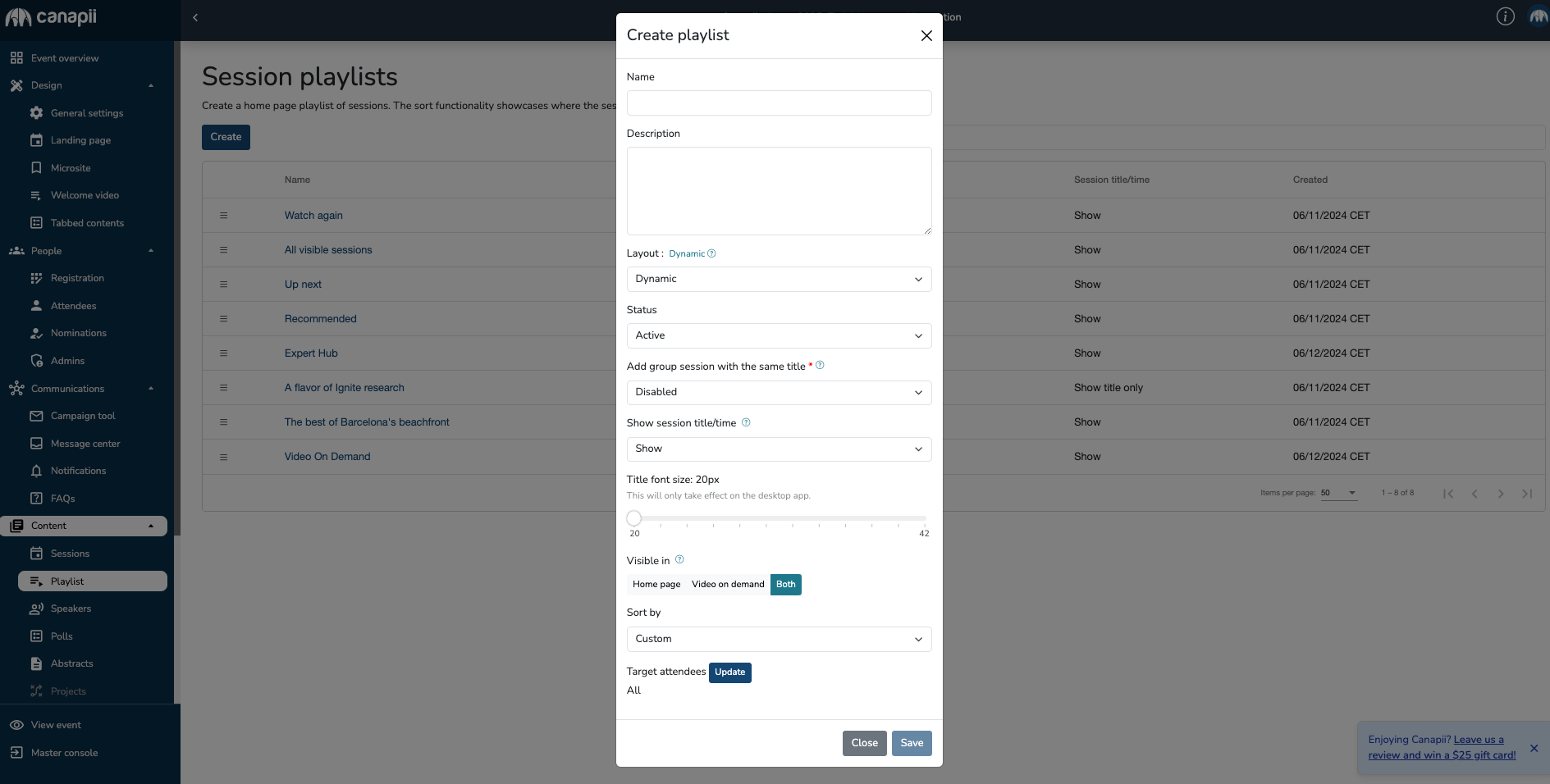 Playlists appear as rows on the event homepage and are made up of sessions. Before you begin to create playlists, you must create your sessions first under Content > Sessions tab.