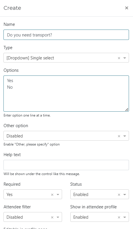 - Your newly created attribute will appear within the registration page for your attendee’s to respond to accordingly.