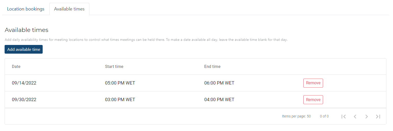 You can help control and set meetings scheduled in certain meeting locations. When a location is set to meetings, the event organizer can set open times of the location similar to session start and end times. The Event organizer can also set different availability times per event date and can have multiple availability times for a single day.