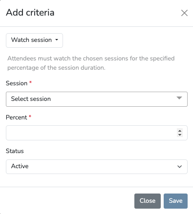 - Watch session – Attendees must watch the chosen sessions for the specified percentage of the session duration (only applies to vod, live, live-breakout, simulive type sessions of the selection)