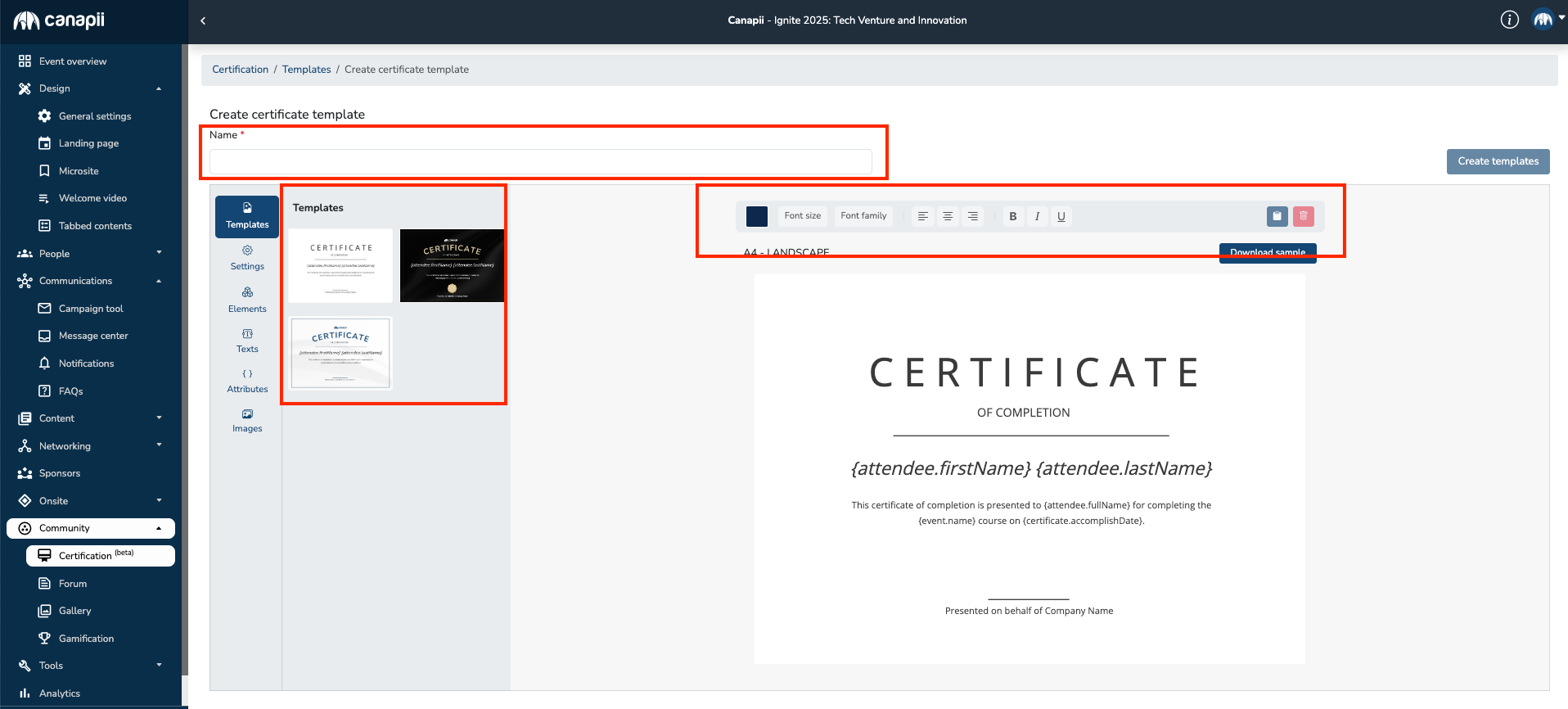 Attributes, on the other hand, refers to the placeholders in your certificate templates that allow you to insert dynamic information into your certificates based on attendee data and information. Additionally, adding any images are also possible by uploading it under Images.