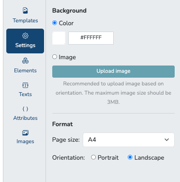 Under Settings, organizers may choose between a solid color or image as the certificate background or change the size format and page orientation. Under Elements and Texts, organizers may choose to either add lines as dividers or add text or phrases to add to the certificate.