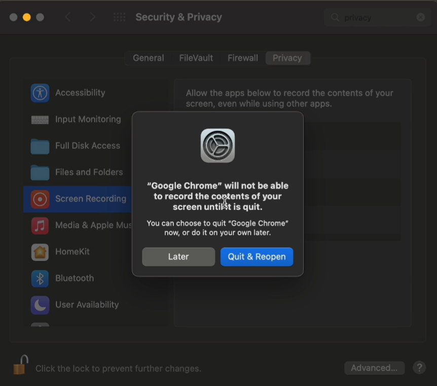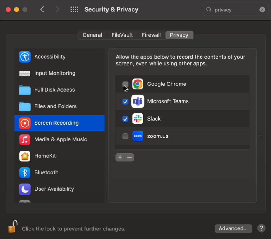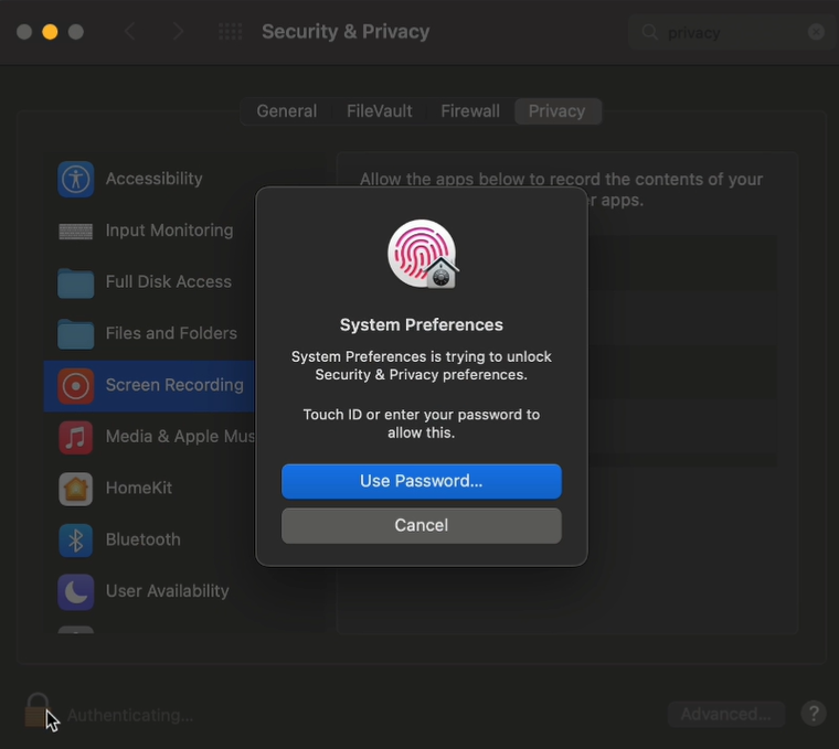 1. Go to your mac settings, search for ‘Privacy‘ and select the Screen recording option.