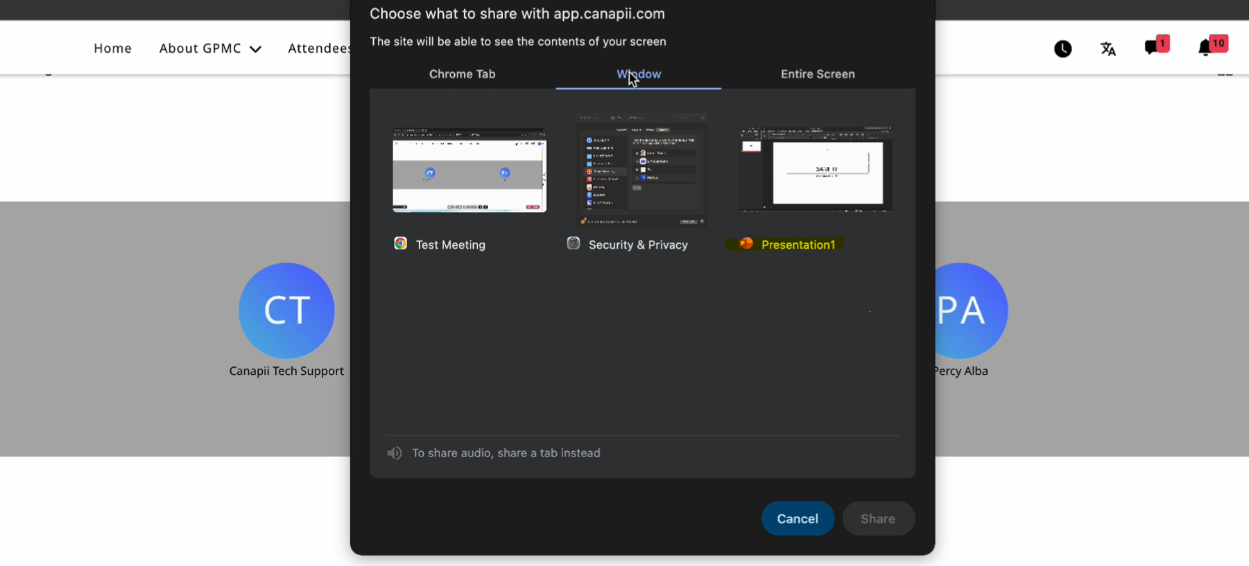 4. Go back to the Canapii meeting session link and click on the Share screen button. You should be able to select the window that you would like to share to your audience.