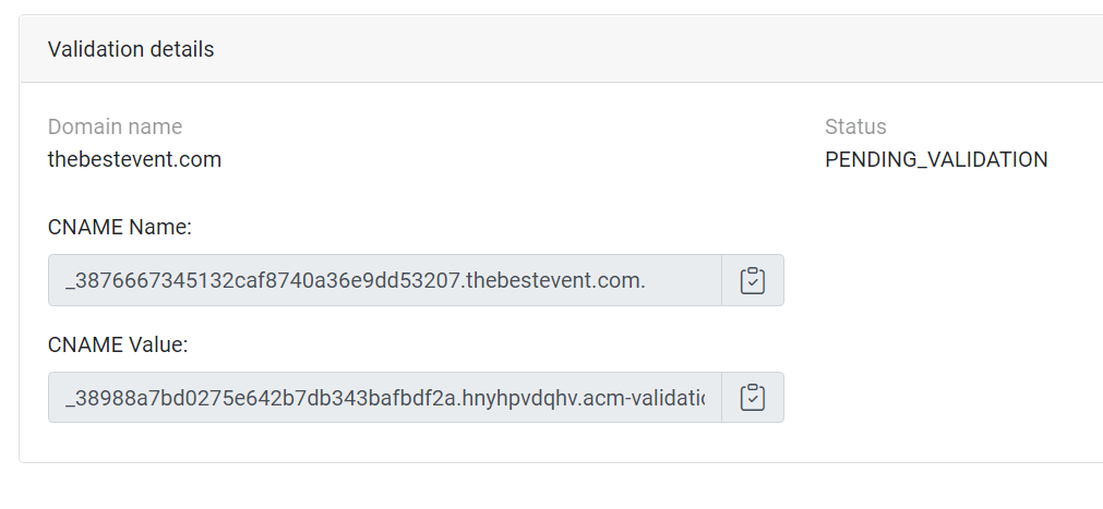 For us to generate the SSL certificate, you need to complete the AWS validation of your domain. The Canapii team will share the information below in order for you to finish the set-up: