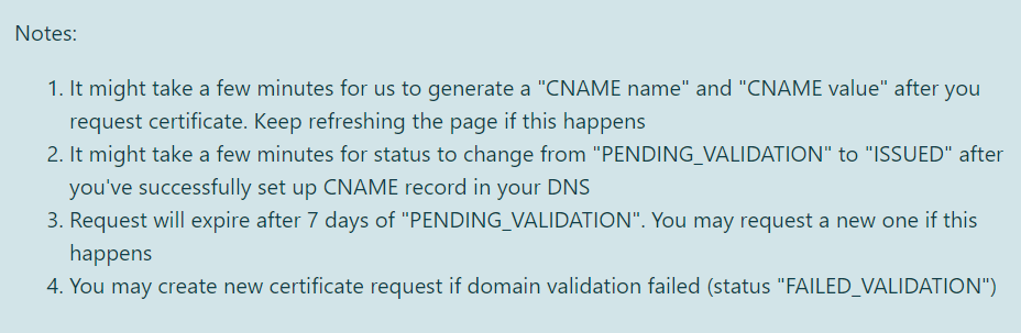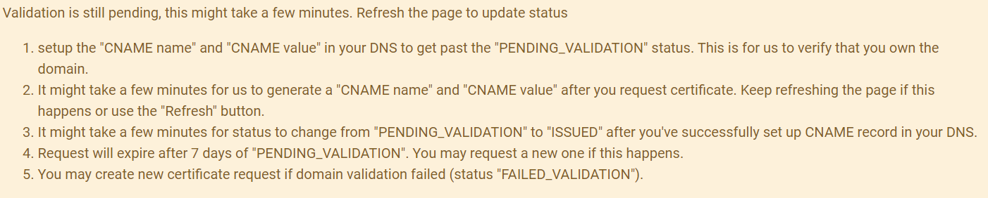 Once you have set up both values to your DNS server, your Status would change to ISSUED.