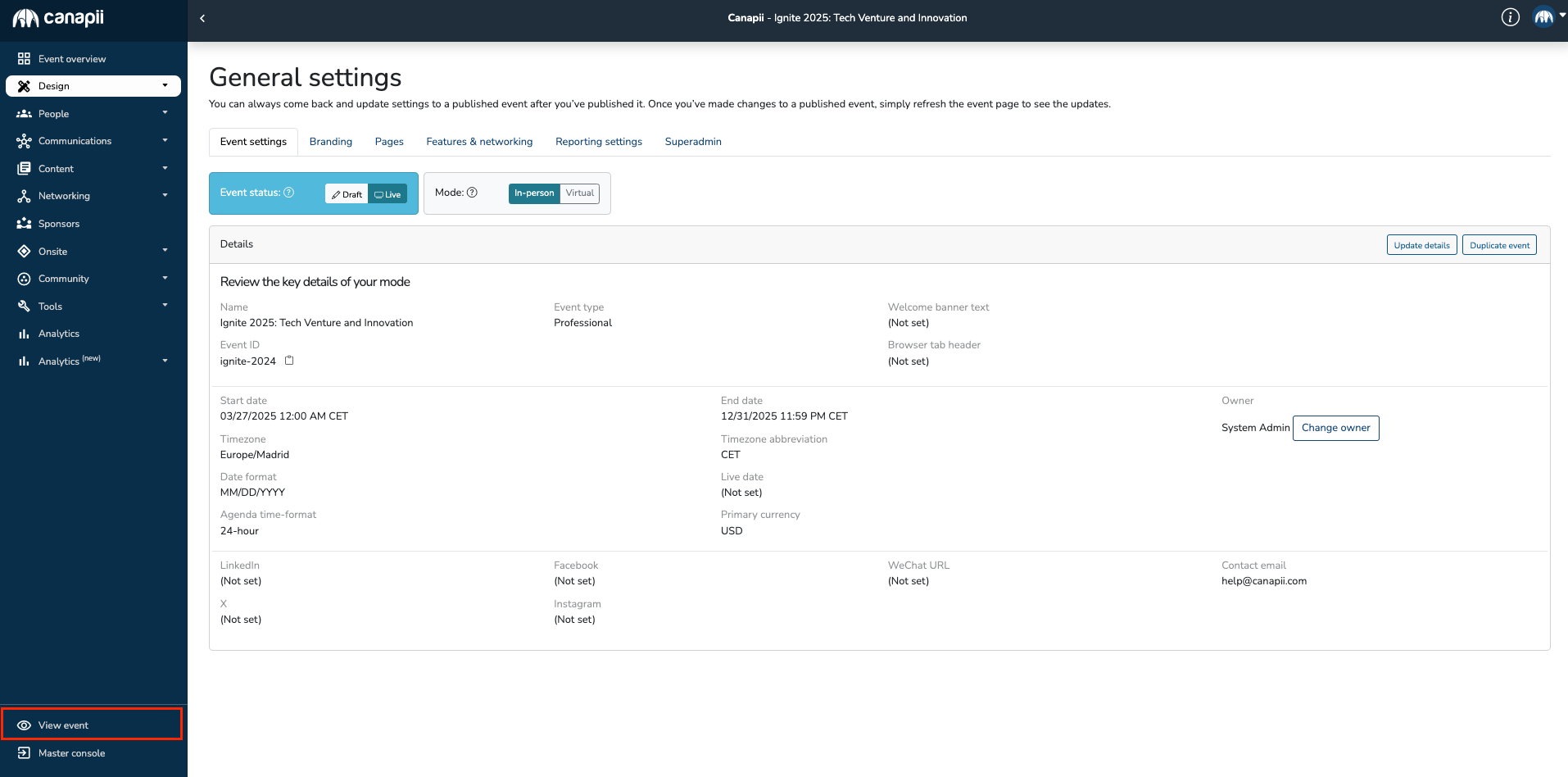 Remember: If your event is in draft mode, only yourself and other admins can see it (please ensure that you have both admin and attendee permissions).