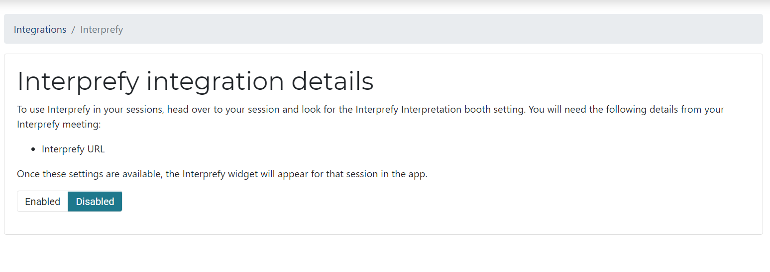 Step 2 > Integrations > Interprefy > Paste the Interprefy token > Ensure that you toggle ‘Active‘ on.