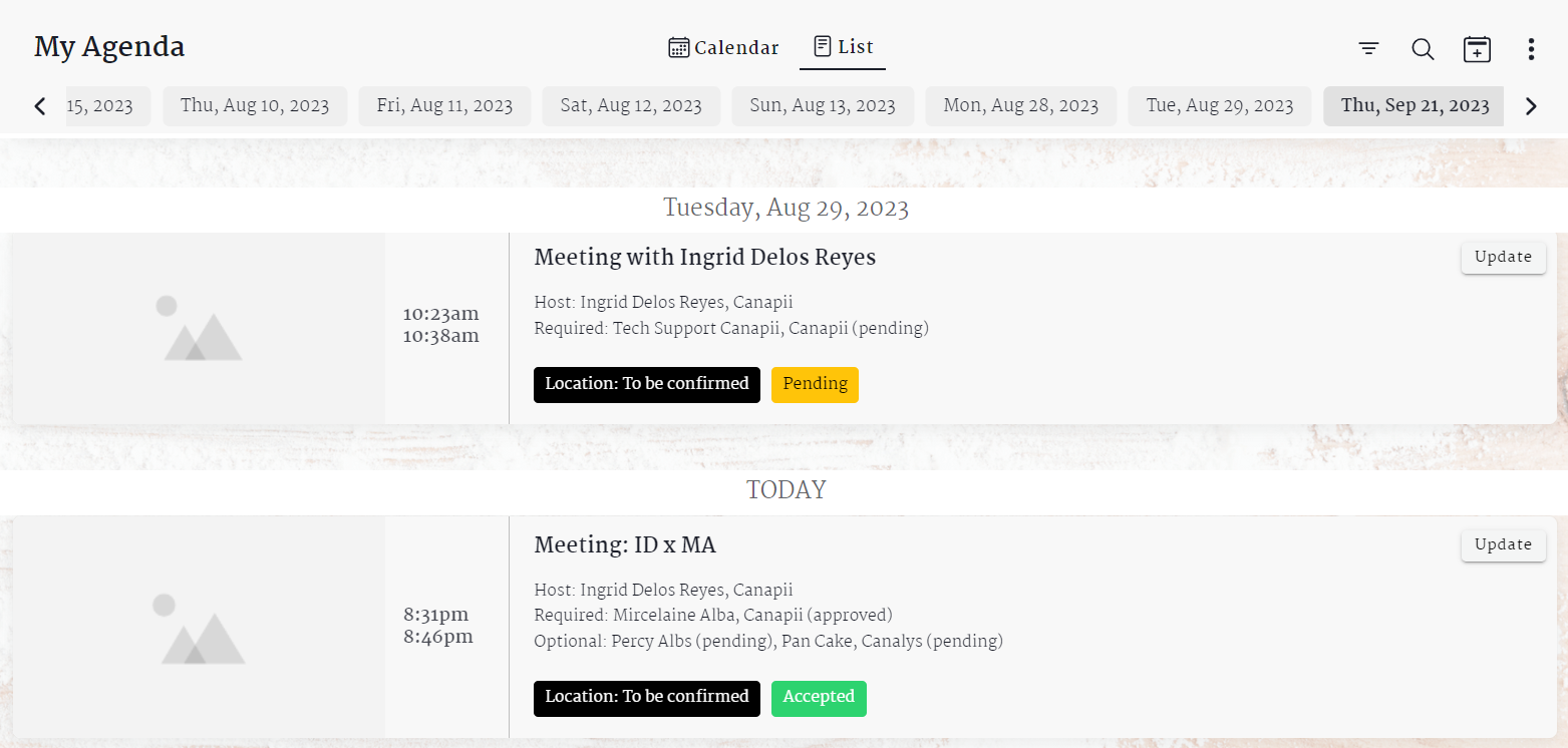 As a user, you are able to easily view the status of your meetings on the meeting list, whether it’s Accepted, Pending, Declined or Cancelled. It is important to note that if an attendee chooses to decline a meeting, there will be an email notification to the meeting organizer indicating the reason for declining the meeting. Once a required attendee approves of the meeting invite the meeting status will be changed to Accepted even when the optional attendees still have not accepted or when the invite status is still pending on their end.
