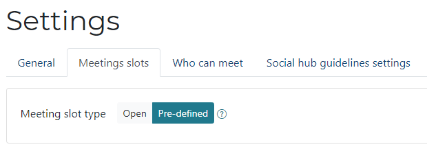 To define timeslots attendees can schedule meetings within, click on settings then the meeting slots tab. You can toggle between Open or Pre-defined.