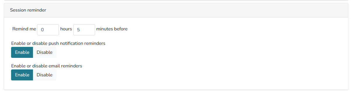 To activate, go into Sessions, then Session Settings and enable either push notification or email session reminder.  By default, the push notification toggle is enabled while email notification is disabled.